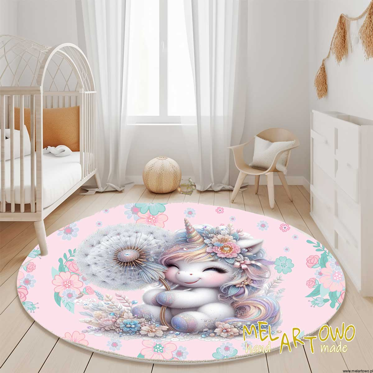 Przepiękna ręcznie wykonana mata podłogowa będzie stanowić niebanalną ozdobę pokoju Waszego dziecka, która pobudzi jego wyobraźnie do kreatywnej baśniowej zabawy, a jednocześnie może stanowić funkcję placu zabaw.