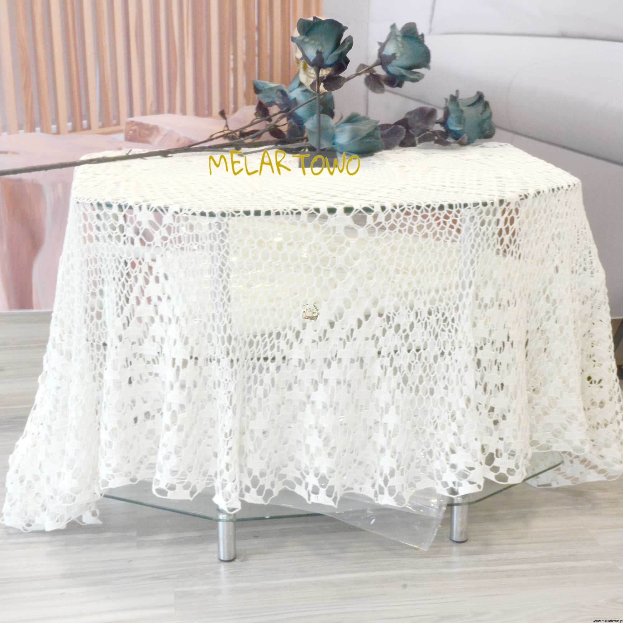 Piękny romantyczny obrus na okrągły stół zrobiony szydełkiem z kordonka. Idealny na specjalne okazje lub prezent dla specjalnej osoby.