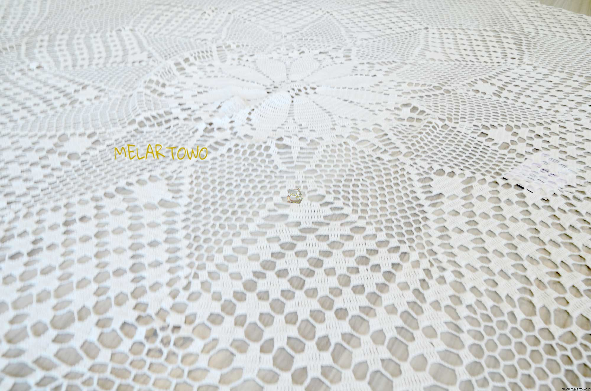 Szydełkowy obrus- koronka zrobiona na szydełku z 100% przędzy bawełnianej w kolorze białawym (nie jest to bielona biel).