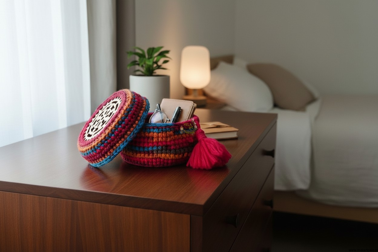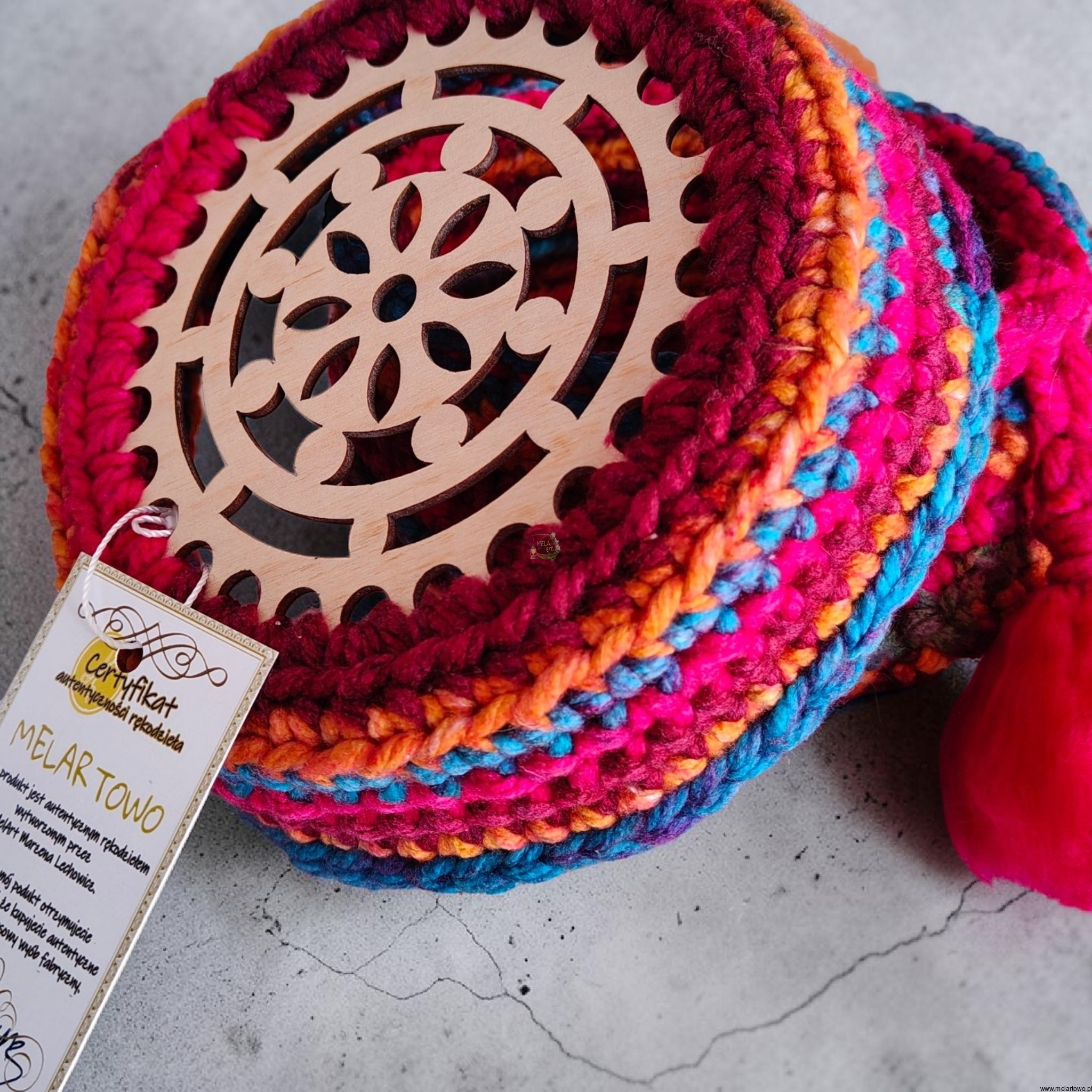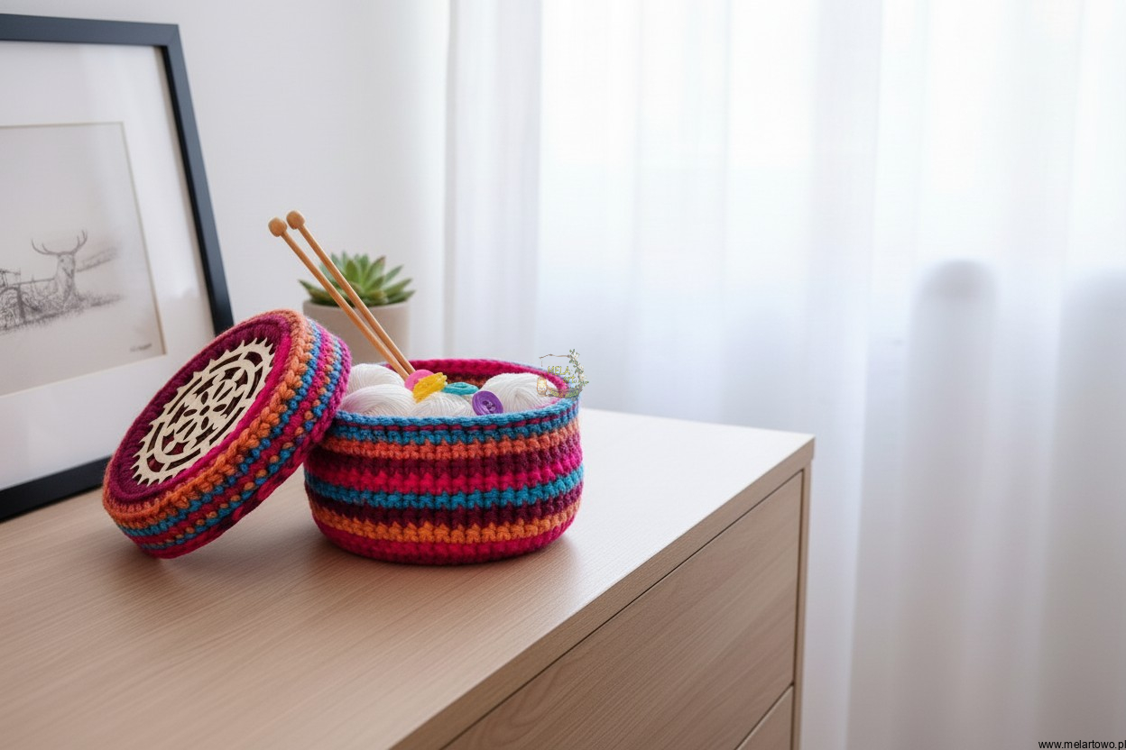 Pojemnik został stworzony z tej samej, grubej i niezwykle miękkiej włóczki o nasyconych, energetycznych barwach. To, co go wyróżnia, to unikatowa pokrywa ozdobiona naturalnym drewnianym kołem, które nadaje mu szlachetnego, ekologicznego charakteru. To rzemiosło, które cieszy oko i jest niezwykle przyjemne w dotyku.