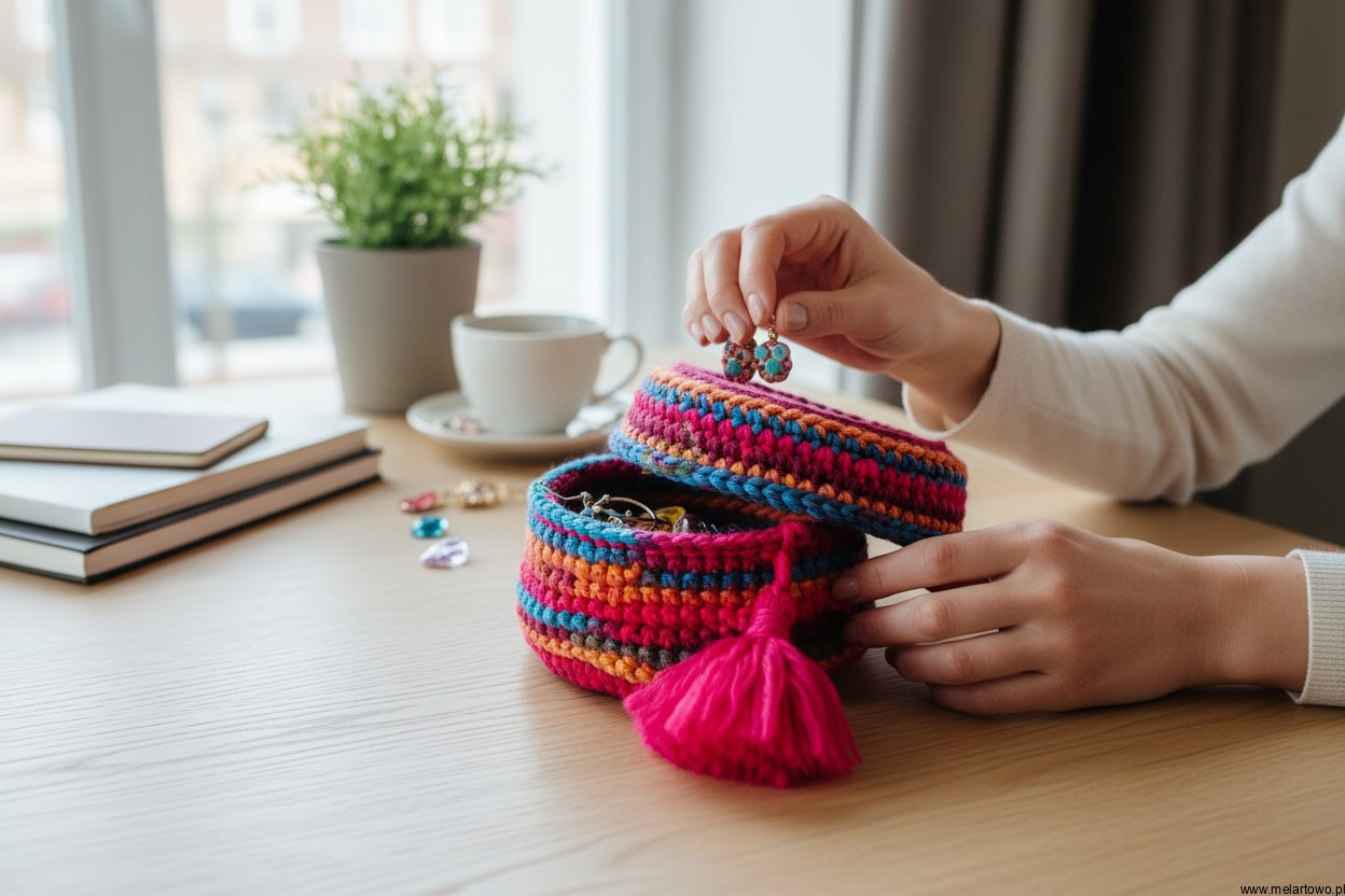 Stylowy organizer na biżuterię: Miękka włóczka zadba o Twoje naszyjniki i bransoletki, a drewniana pokrywa ochroni je przed kurzem.